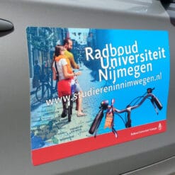 De magneetplaat heeft een dikte van 0,85mm dikte; dit geeft voldoende kleefkracht. De magneetplaat wordt beplakt met een hoogwaardig polymeer fullcolour sticker inclusief polymeer laminaat glans beschermlaag. Deze beschermlaag biedt bescherming tegen weersinvloeden onder andere regen, UV-zonlicht en vuil. De opdruk op de sticker wordt gemaakt van CMYK Eco-solvent inkten, geprint met onze fullcolour printer, een Roland XJ540. De opdruk kan ook gemaakt worden uit snijfolies afhankelijk van het aantal kleuren opdruk. De hoekjes worden standaard afgerond met een radius van 10mm. Wil je liever rechte hoeken? Geef dit dan aan in de bestelling.
